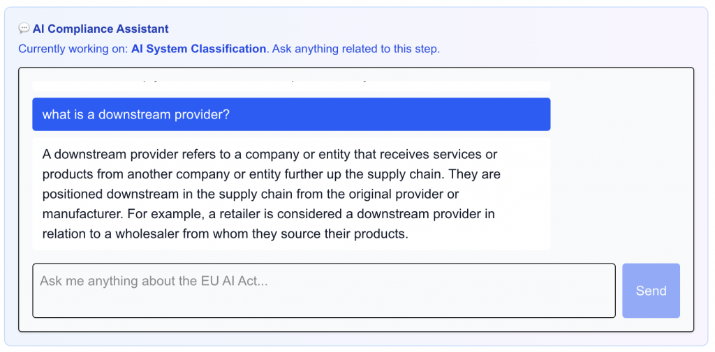 Regulatory interpretation engines are AI-powered tools designed to analyse and translate complex legal texts into actionable compliance steps. They process regulatory requirements like the EU AI Act, identify applicable obligations for a company’s specific use cases, and suggest workflows or documentation needs (Brkan & Bonnet, 2022).